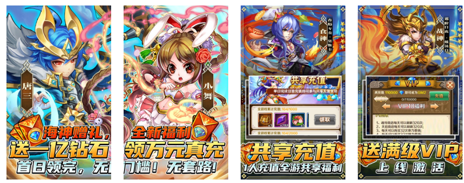 1、上线送满级VIP、1000w钻石