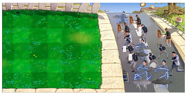 5、拖动卡片到右侧绿色的方块草坪上,合理的布局,有效阻止明星僵尸们的进攻,第一排和第二排建议如图示放置。