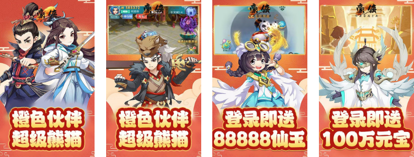 上线福利: 登录即送VIP15、100万元宝、88888仙玉、橙色伙伴超级熊猫